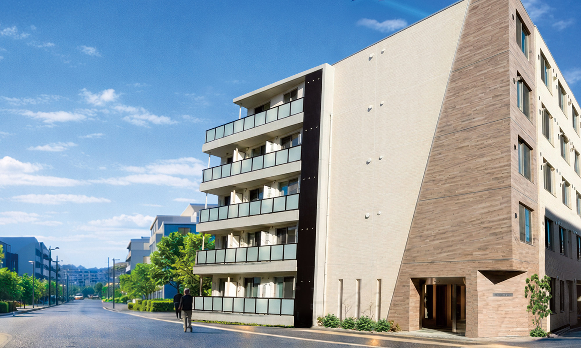 外観イメージは、建築中の建物と現地周辺を撮影したものに、
